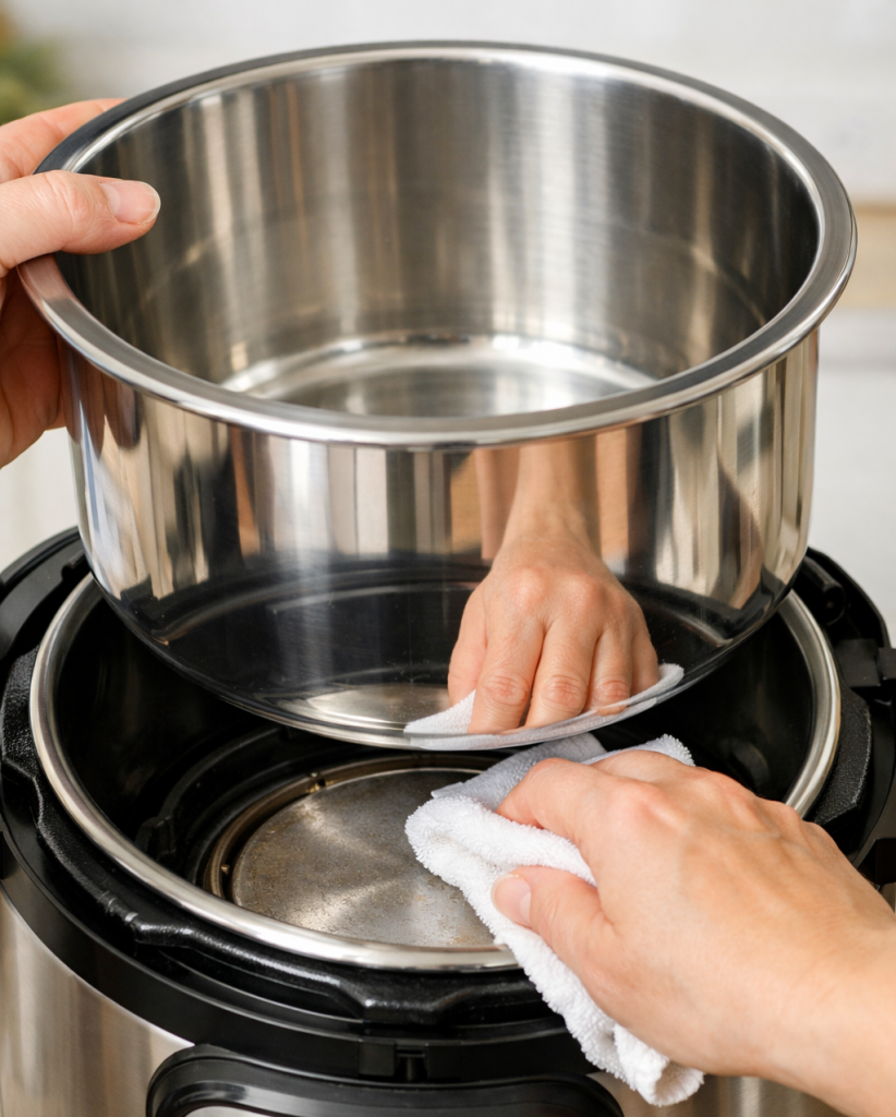 Remove the inner pot from your Instant Pot and wash it thoroughly using warm water, mild dish soap, and a non-abrasive sponge. Pay close attention to the bottom and sides where starches, fats, or sugars may have formed a thin film—these residues are a common source of overheating and burning odors.